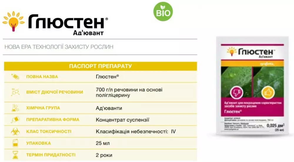 Глюстен обязателен для применения на культурах с восковым покровом листа, на гладких поверхностях (например капуста, лук, хвойные растения), на растениях с опушенным листом (томаты, лаванда и др.). Из-за особенностей их строения препаратам очень трудно на них задерживаться и проникать внутрь.
