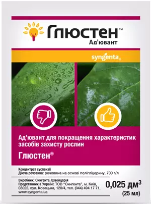 Глюстен - Адъювант, уменьшает риски фитотоксичности растений, препарат природного происхождения, поэтому безопасен для полезной энтомофауны. Улучшает эффективность средств защиты растений как в типичных, так и в сложных условиях. Обеспечивает надежное удержание капель рабочего раствора, его распространение, усиливает поглощение растением без риска стекания. Адъюванты имеют важнейшую роль в современной технологии защиты растений, ведь снижают расходы основного препарата, уменьшая негативное влияние пестицидов на экологию, делая обработки более экономичными и эффективными.