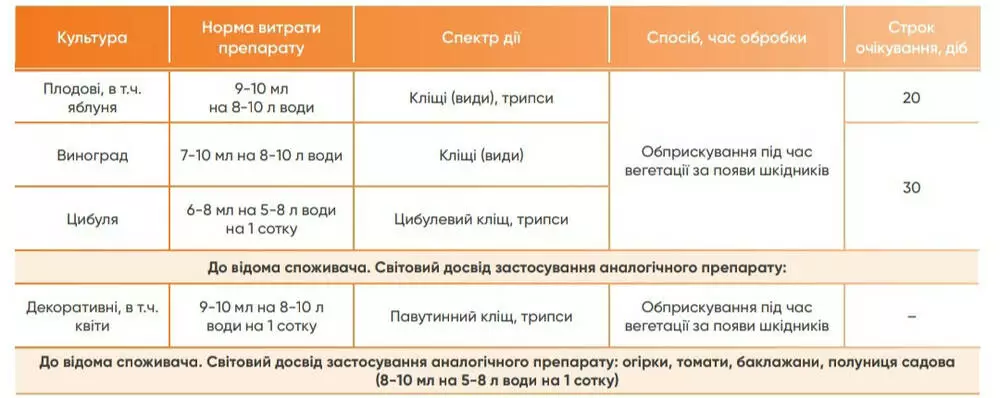 | Плодовые, в т. ч. яблоня | 9-10 мл на 8-10 л воды | Клещи (виды), трипсы | Опрыскивание во время вегетации при появлении вредителей | 20 |