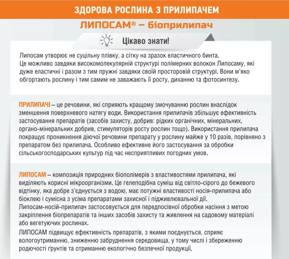 Часто причиной стресса для сельскохозяйственных растений являются болезни и вредители, бесконтрольное применение пестицидов, несбалансированность удобрений, отклонения от оптимальных значений температуры воздуха и влажности почвы. Липосам помогает смягчить стресс культурным растениям. Поскольку экзополисахариды, которые являются основой прилипателя Липосам, при контакте с листьями или корневой массой активируют деятельность тех ферментов, которые запускают процесс усиления защитных реакций у растений. Биополимеры Липосама имеют специфические свойства, которые позволяют регулировать процессы роста и развития растений. Как результат, под влиянием Липосама ростовые процессы корней и надземной вегетативной массы могут усиливаться на 12-15%. Также, будучи продуктом жизнедеятельности агрономически ценных микроорганизмов, этот биоприлипатель выступает дополнительным источником питания растений.