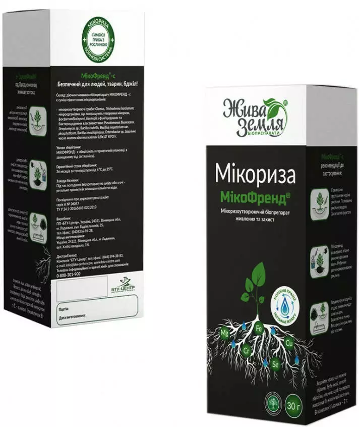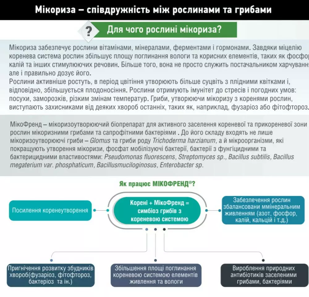 Микофренд - это микоризообразующий биопрепарат, созданный на основе микоризообразующих грибов Glomus VS и Trichoderma Harzianum. При применении микоризообразующего препарата Микофренд происходит активное заселение корневой и прикорневой зоны микоризообразующими грибами и сапрофитными ризосферными бактериями, синтез природных антибиотических веществ заселёнными грибами и бактериями, усиление корнеобразования и развитие здоровой корневой системы, защита от возбудителей корневых гнилей, увеличение площади поглощения корневой системой элементов питания и влаги из почвы за счет развития микоризы, обеспечение витаминами, фитогормонами, аминокислотами, а также сбалансированным минеральным питанием (азот, фосфор, калий, кальций и. т. д).