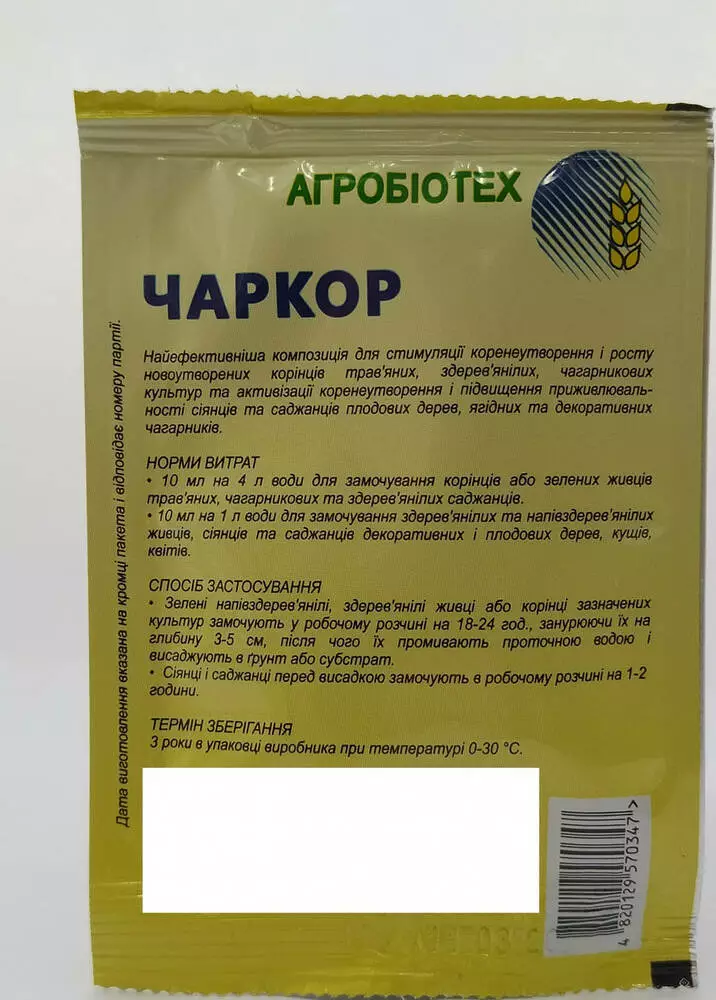 Спосіб застосування: зелені напівздеревянілі, здерев’янілі живці або корінці зазначених культур замочують у робочому розчіні на 18-24 год., занурюючи їх на глибину 3-5 см,після чого їх промивають проточною водою і висаджують в грунт або субстрат. Сіянці і саджанці перед висадкою замочують в робочому розчині на 1-2 години.