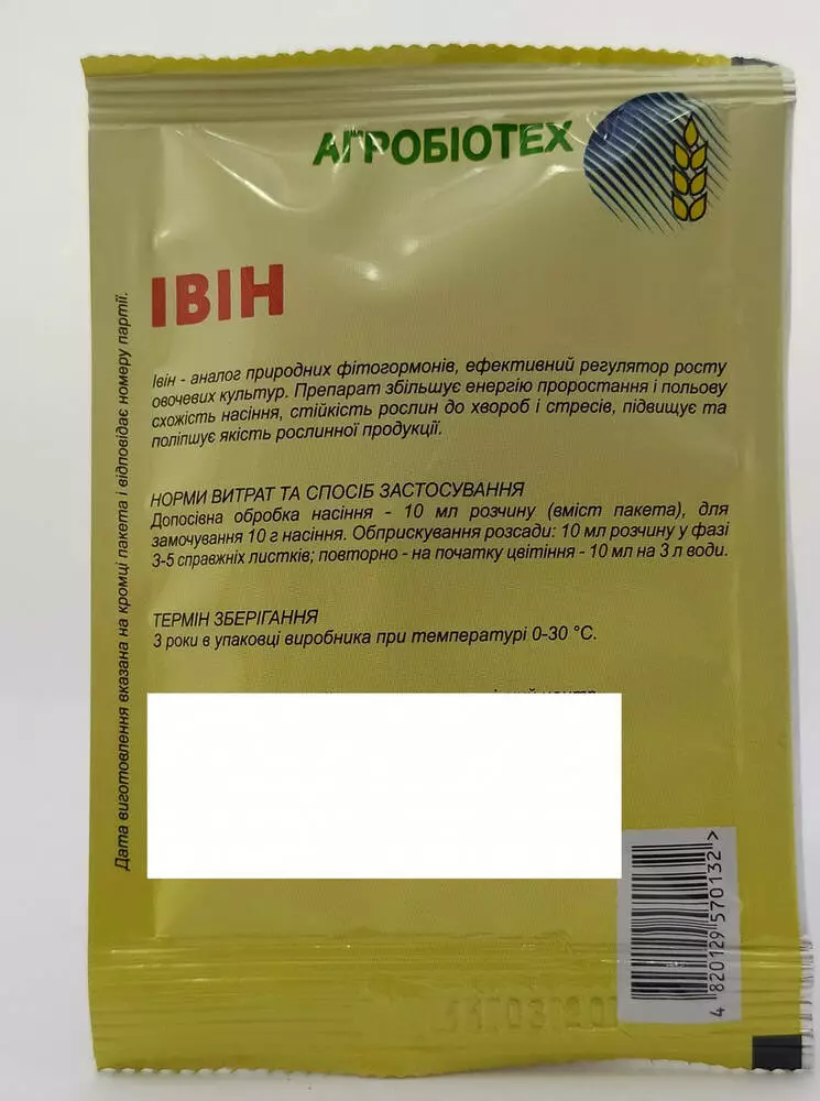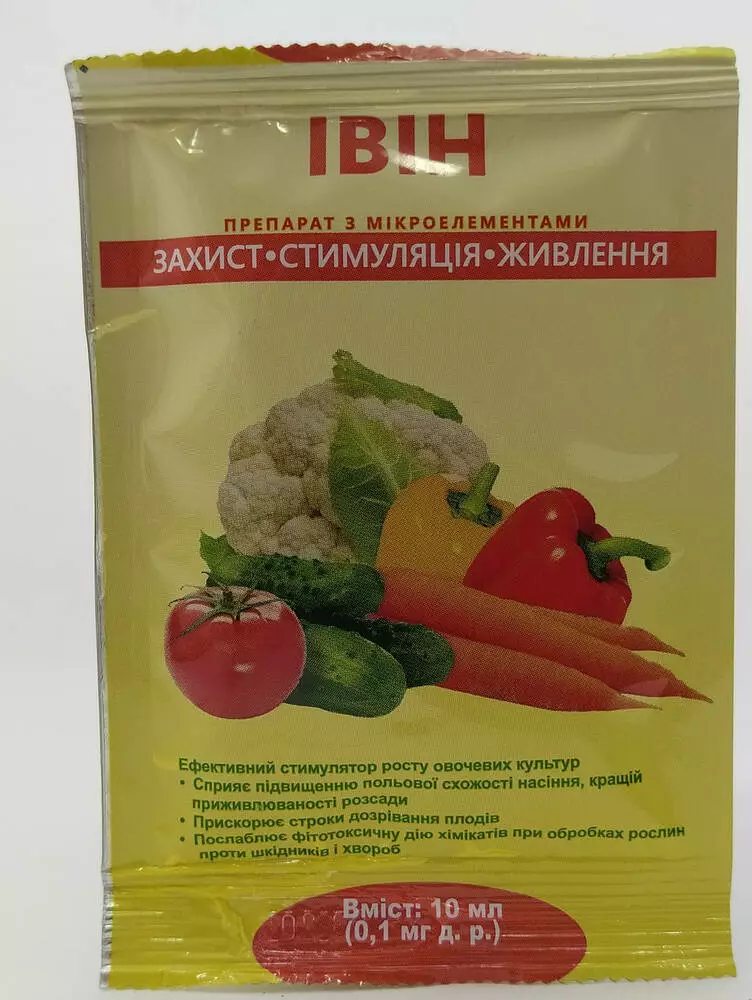 Івін – аналог природних фітогормонів, ефективний регулятор росту овочевих культур. Препарат збільшує енергію проростання і польову схожість насіння, стійкість рослин до хвороб і стресів, підвищує та поліпшує якість рослинної продукції.