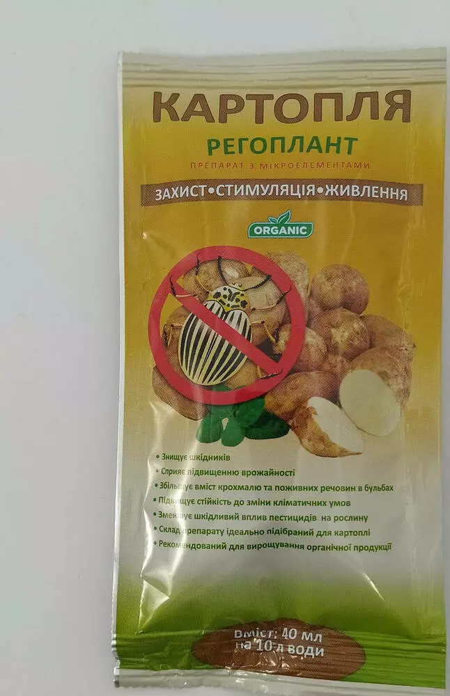 Регоплант – новітній захисно-стимлюючий препарат,що активізує основні процеси дихання та живлення рослини, імунну систему,запобігає появі та розвитку хвороб, захищає від колорадського жука та знищує його імаго (личинка), дротяника, знижує фітотоксичну дію пестицидів та інших хімічних залишків,сприяє кращому розвитку кореневої системи та збільшенню листової поверхні, за рахунок чого рослина краще переносить посуху та високі температури. Швидко поглинаеться рослиною (2-3 години).