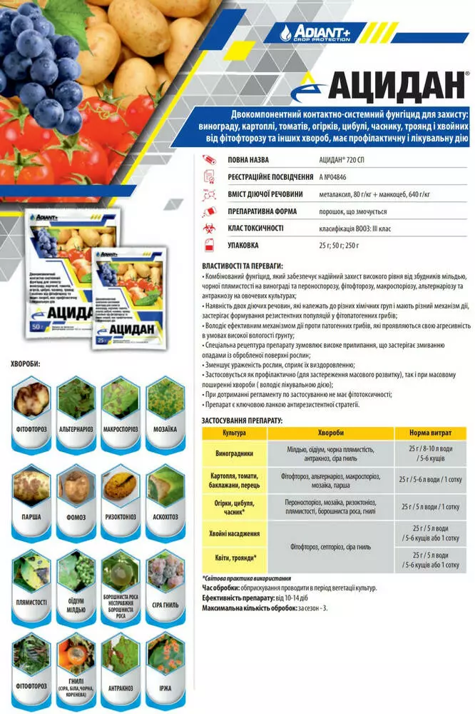 Ацидан - Двухкомпонентный контактно-систеиний фунгицид для защиты: винограда, картофеля, томатов, огурцов, лука, чеснока, роз, хвойных от фитофтороза и других болезней, имеет профилактическое и лечебное действие.