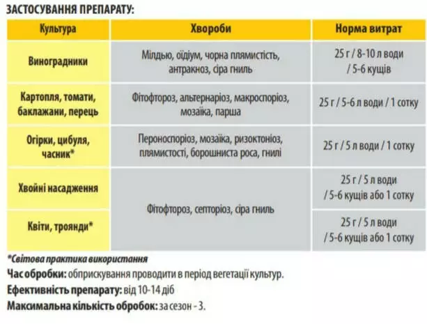 | Виноградники | Милдью, оидиум, черная пятнистость, антракноз, серая гниль | 25 г / 5-6 л воды / 5-6 кустов |