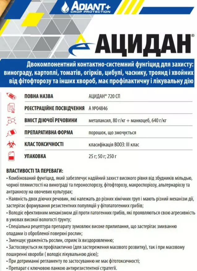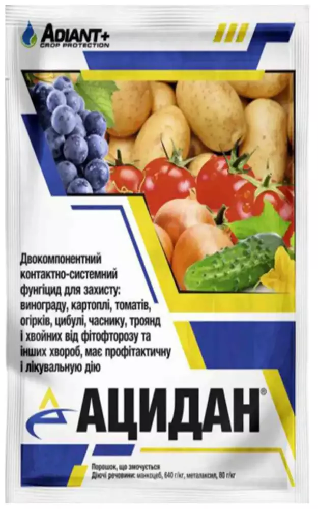 Ацидан - Двухкомпонентный контактно-систеиний фунгицид для защиты: винограда, картофеля, томатов, огурцов, лука, чеснока, роз, хвойных от фитофтороза и других болезней, имеет профилактическое и лечебное действие.