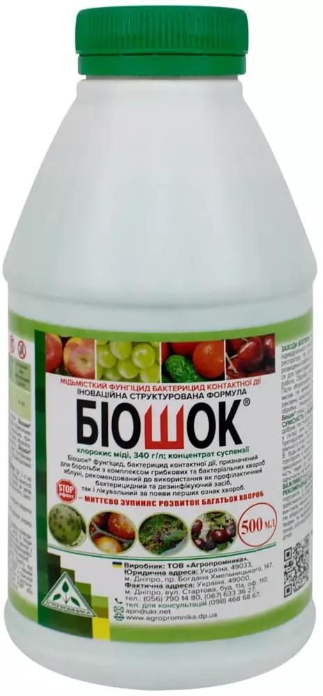 Биошок - Фунгицид, бактерицид контактного действия, предназначенный для борьбы с комплексом грибковых и бактериальных болезней, болезней яблони, рекомендован к использованию как профилактическое бактерицидное и дезинфицирующее средство, так и лечебное при появлении первых признаков болезней.