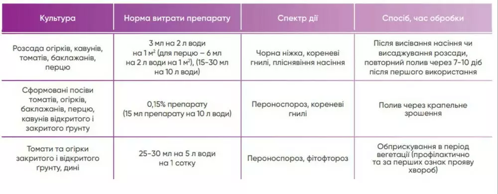 | Томаты и огурцы закрытого и открытого грунта, дыни, дыни | 25-30 мл на 5 л воды на 1 сотку | Пероноспороз, фитофтороз | Опрыскивание в период вегетации (профилактически и при первых признаках проявления болезней) |