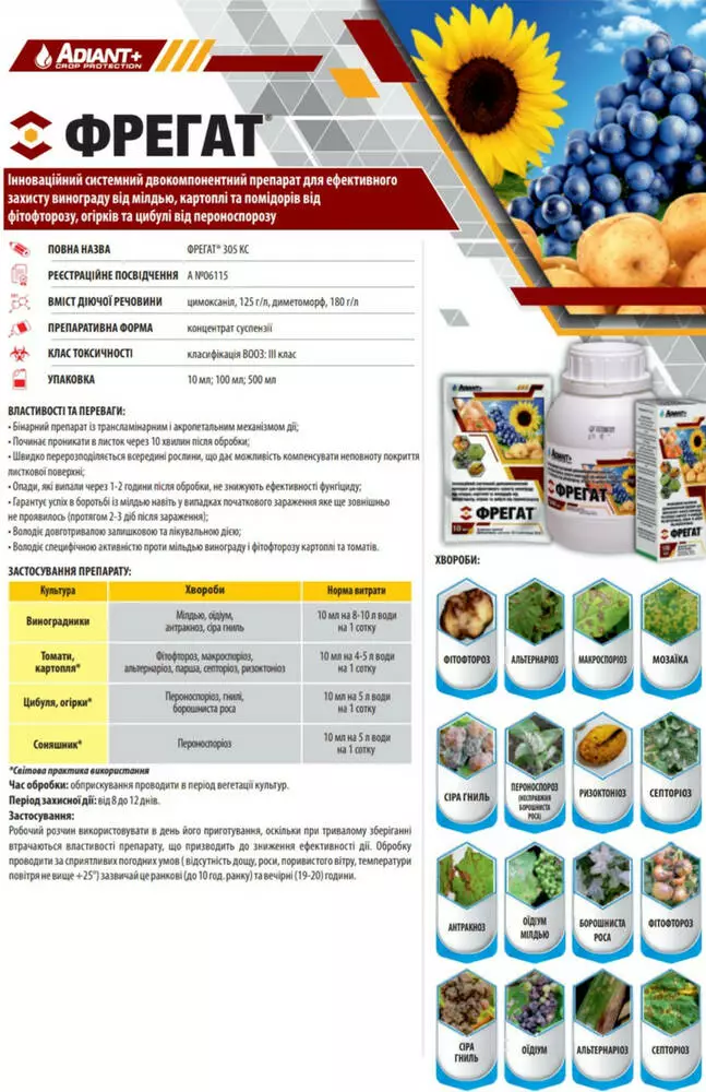 Фрегат - Инновационный системный двухкомпонентный препарат для эффективной защиты винограда от милдью, картофеля и помидоров от фитофтороза, огурцов и лука от пероноспороза.
