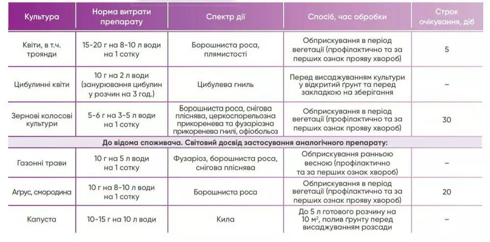 | Зерновые колосовые культуры | 5-6 г на 3-5 л воды на 1 сотку | Мучнистая роса, снежная плесень, церкоспорельозна прикорневая и фузариозная прикорневая гнили, офиоболез | Опрыскивание в период вегетации (профилактически и при первых признаках проявления болезней) | 30 |