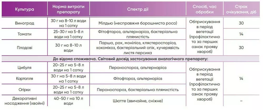 Виноград 30 г на 8-10 л воды на 1 сотку Милдью (ложная мучнистая роса) Опрыскивание в период вегетации (профилактически и при первых признаках проявления болезней) 30
