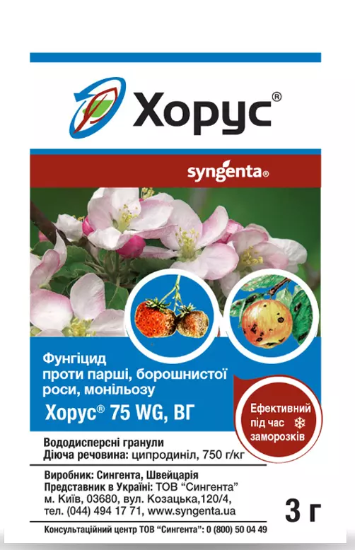 Хорус - чрезвычайно эффективный с уникальным механизмом действия фунгицид против возбудителей таких болезней, как парша, мучнистая роса, монилиоз. Кроме того, препарат надежно действует при низких температурах (+5°С), имеет трансламинарное и контактное действия. Последнее опрыскивание перед уборкой урожая существенно улучшает лежкость плодов в хранилищах. Снижает потери от гнилей на 30-40%. Хорус чрезвычайно эффективен против монилиального ожога косточковых (вишня, абрикос, слива, алыча, черешня) и курчавости листьев персика. Препарат обладает высокой эффективностью против различных видов гнилей плодов, ягод и винограда. Лечебное действие - 2 суток, защитное - 10-12 дней. Безопасен для пчел, полезных насекомых и окружающей среды. Относится к малотоксичным препаратам (ЛД50>2000 мг/кг). Применение препарата в фазе распускания почек и розового бутона гарантирует высокую эффективность последующих фунгицидных обработок.