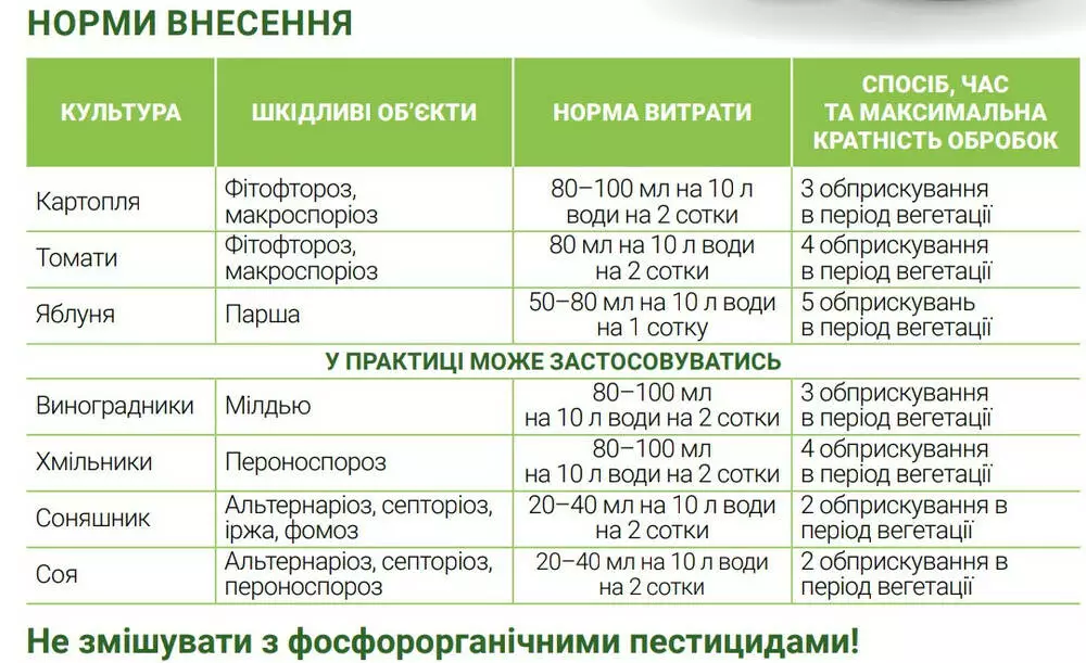 Соя Альтернариоз, септориоз, пероноспороз 20-40 мл на 10 л воды на 2 сотки 2 опрыскивания в период вегетации