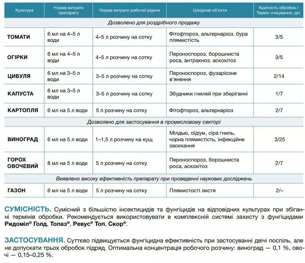 Разрешается опрыскивать растения трижды за сезон, но не более, чем дважды подряд. Существенно повышается фунгицидная эффективность при применении дважды подряд. Оптимальная концентрация рабочего раствора: виноград - 0,1%, овощи - 0,15-0,25%.