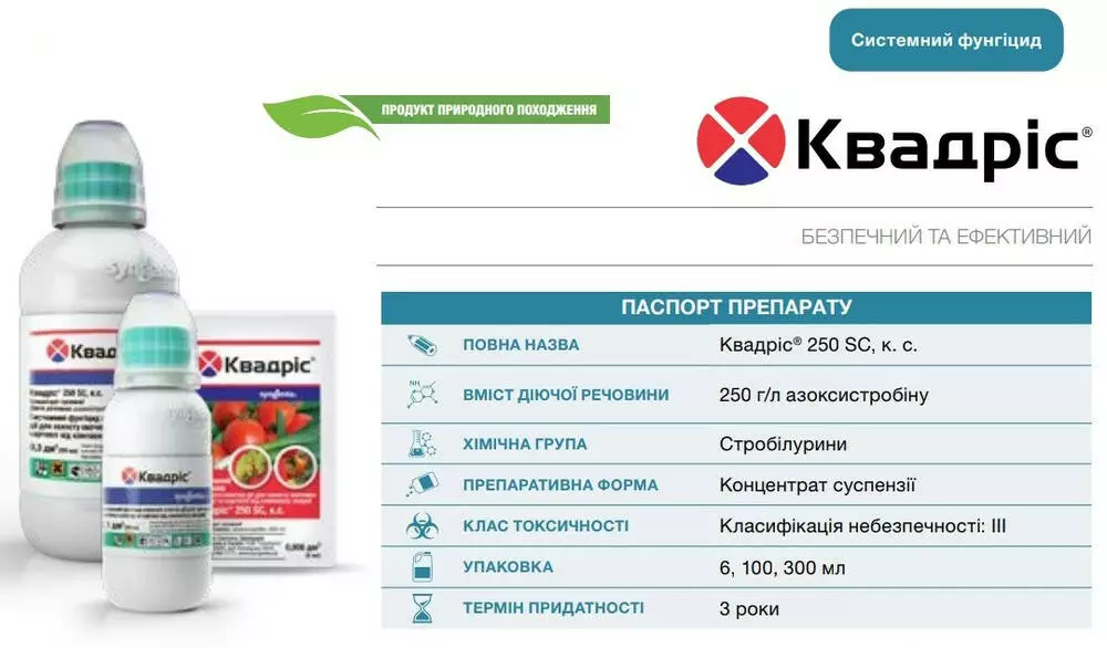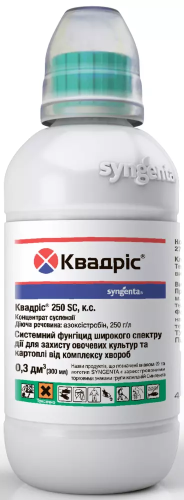 Квадрис - Новый уникальный фунгицид из нового класса препаратов - стробилуринов. Имеет системное, профилактическое лечебное, искореняющее действие и трансламинарное свойство. Лечебное действие - 2 суток, что позволяет уничтожить возбудителя болезни во время инкубационного периода. Искореняющее действие позволяет остановить распространение инфекции и развитие болезни на участке. Единственный препарат, который защищает овощные культуры от всех основных болезней: мучнистой росы, фитофтороза, макроспориоза, ложной мучнистой росы, пятнистости и др. Квадрис не только позволяет защитить и вылечить растения, но и продлевает на 2-3 недели плодоношение культур. Применение в период уборки овощей существенно улучшает их хранение в хранилищах и домашних условиях. Препарат относится к малотоксичным (ЛД50>2000 мг/кг). Нетоксичен для пчел, безопасен для пользователя и окружающей среды. Продолжительность защитного действия - 12-14 дней.