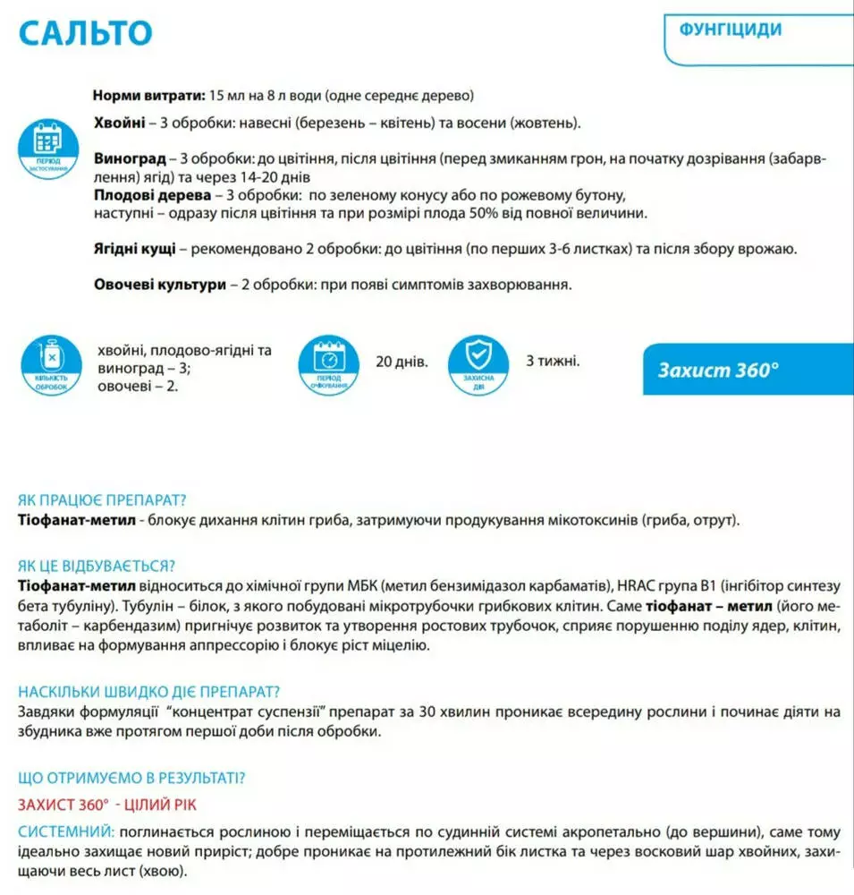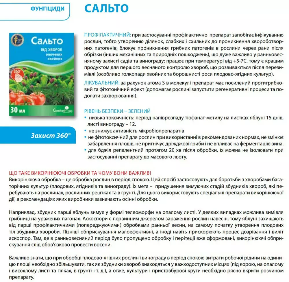 Сальто - Системный фунгцицид для защиты деревьев, кустов, овощей и винограда.
