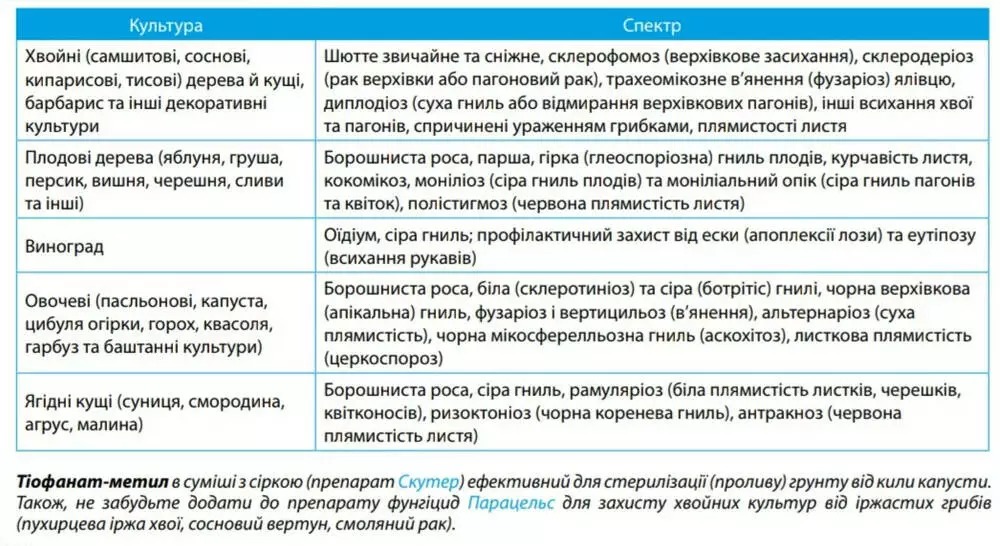 Овощные (пасленовые, капуста, лук огурцы, горох, фасоль, тыква и бахчевые культуры, свекла сахарная) Мучнистая роса, белая (склеротиниоз) и серая (ботритис) гнили, черная верхушечная (апикальная) гниль, фузариоз и вертициллез (увядание), альтернариоз (сухая пятнистость), черная микосфереллезная гниль (аскохитоз), листовая пятнистость (церкоспороз)