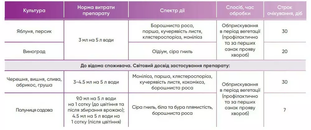 | Яблоня, персик | 3 мл на 5 л воды | Мучнистая роса, парша, курчавость листьев, клястероспориоз, монилиоз | Опрыскивание в период вегетации (профилактически и при первых признаках проявления болезней) | 30 |