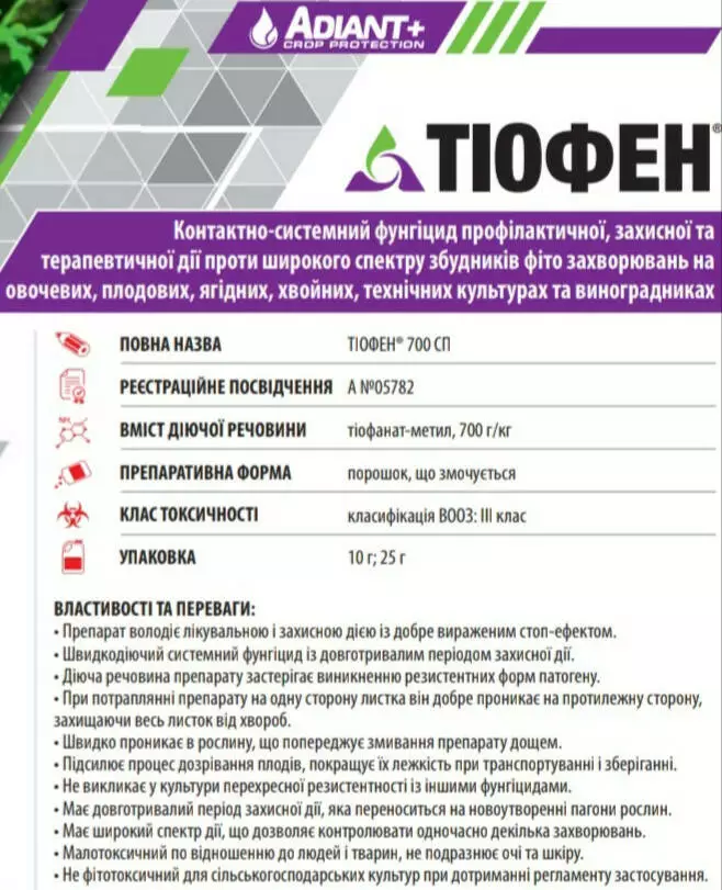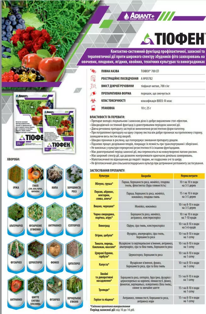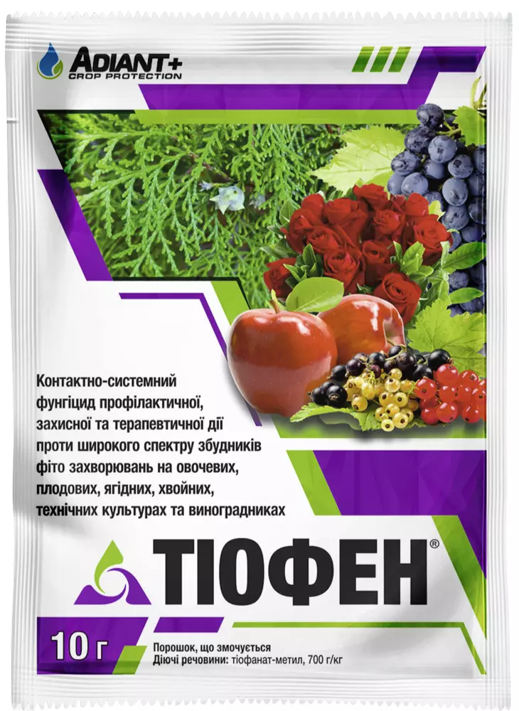 Тиофен - Контактно-системный фунгицид профилактического, защитного и терапевтического действия против широкого спектра возбудителей фито заболеваний на овощных, плодовых, ягодных, хвойных, технических культурах и виноградниках.