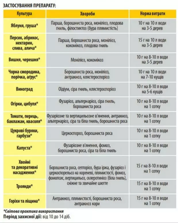 | Персик, абрикос, нектарин, слива, алыча | Парша, мучнистая роса, монилиоз, кокомикоз, плодовая гниль | 15 г на 10 л воды на 3-5 деревьев |