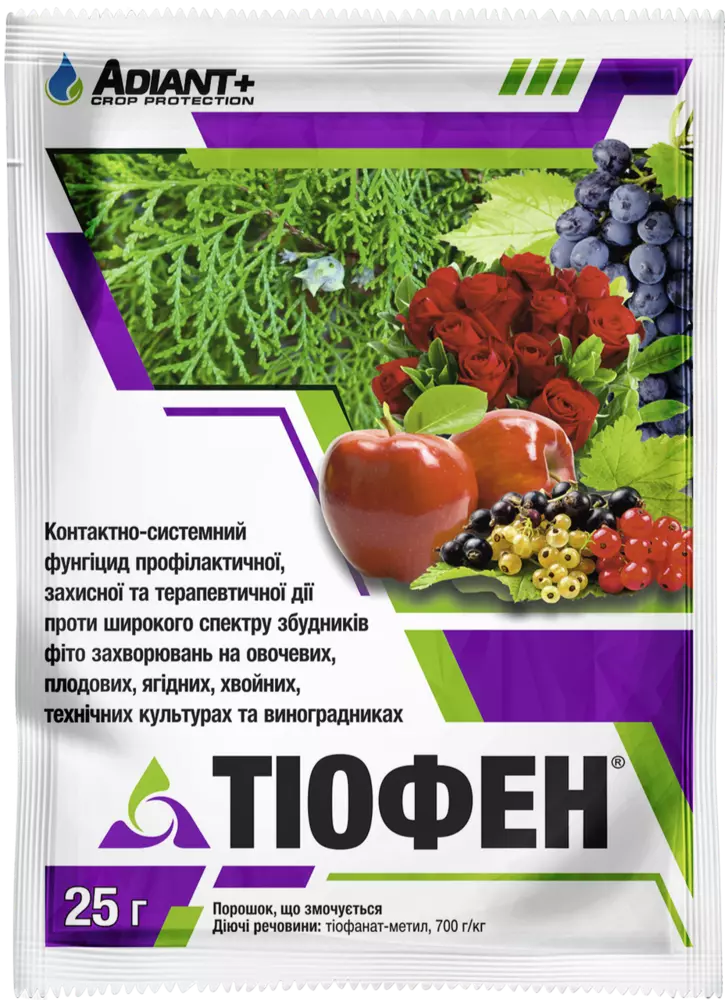 Тиофен - Контактно-системный фунгицид профилактического, защитного и терапевтического действия против широкого спектра возбудителей фито заболеваний на овощных, плодовых, ягодных, хвойных, технических культурах и виноградниках.