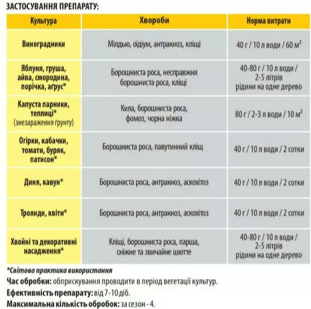 Яблоня, груша, айва, смородина, смородина, красная смородина, крыжовник Мучнистая роса, ложная мучнистая роса, клещи 40-80 г / 10 л воды / 2-5 литров жидкости на одно дерево