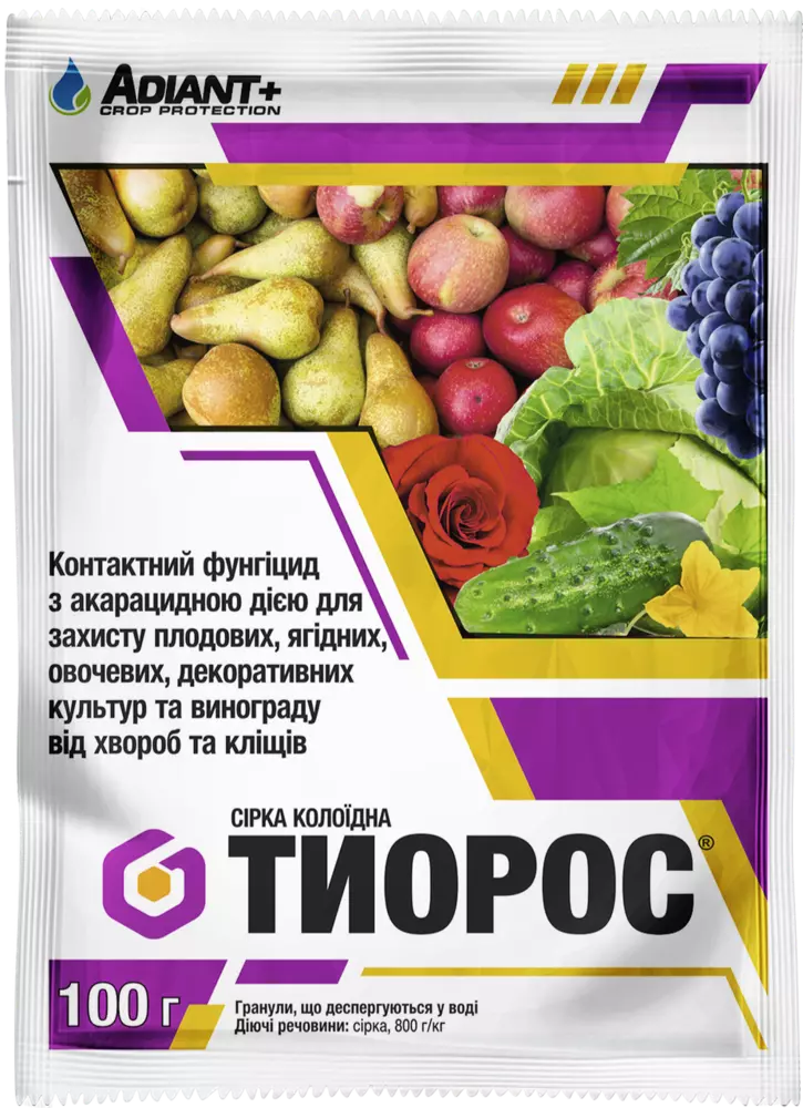Тиорос - Контактный фунгицид с акарицидным действием для защиты плодовых, ягодных, овощных, декоративных культур и винограда от болезней и клещей.