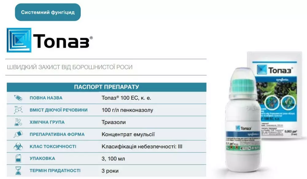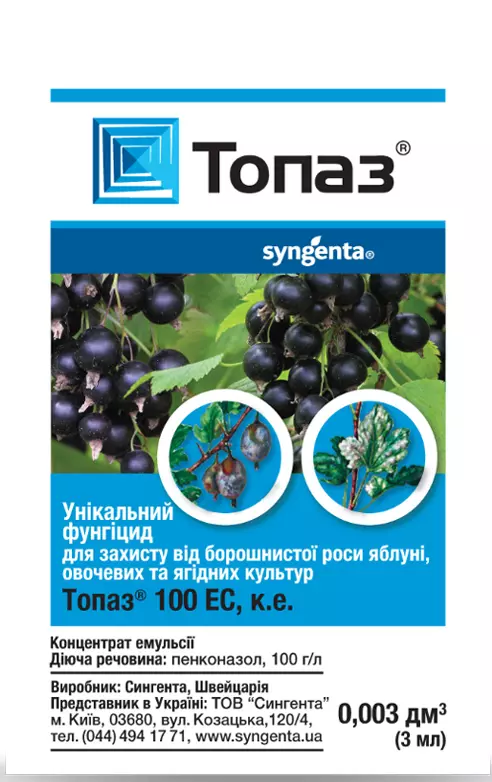 У Топаз широкая регистрация: препарат применяют на черной смородине и других ягодных культурах, овощах (огурцы), плодовых и декоративных культурах, винограде. Очень эффективен при высоких температурах, то есть в условиях, благоприятных для развития мучнистой росы. Топаз имеет сильное трансламинарное и системное действие, благодаря чему распространяется по растению и обеспечивает длительную защиту. Препарат относится к малотоксичным (ЛД50>3000 мг/кг). Безопасен для пользователей и окружающей среды.