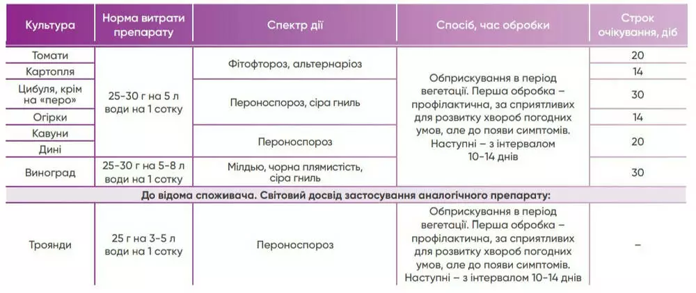 | Виноград | 25-30 г на 5-8 л воды на 1 сотку | Милдью, черная пятнистость, серая гниль | 30 | |