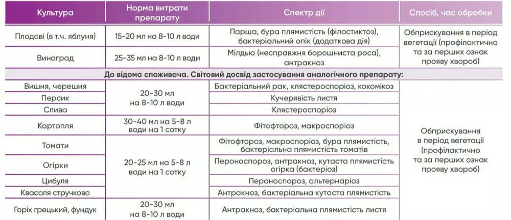 | Плодовые (в т.ч. яблоня) | 15-20 мл на 8-10 л воды | Парша, бурая пятнистость (филостиктоз), бактериальный ожог (дополнительное действие) | Опрыскивание в период вегетации (профилактически и при первых признаках проявления болезней) |
