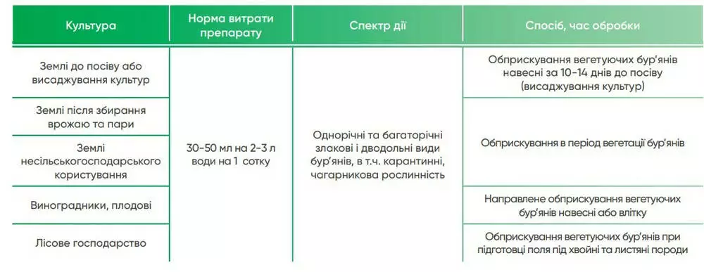 | Земли к посеву или высадке культур | 30-50 мл на 2-3 л воды на 1 сотку | Однолетние и многолетние злаковые и двудольные виды сорняков, в т. ч. карантинные, кустарниковая растительность | Опрыскивание вегетирующих сорняков весной за 10-14 дней до посева (высадки культур) |