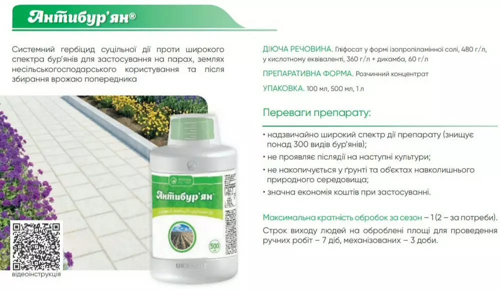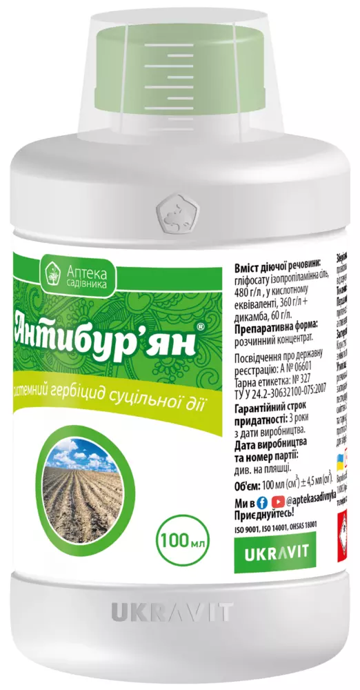 Антибурьян - Системный гербицид сплошного действия против широкого спектра сорняков для применения на парах, землях несельскохозяйственного пользования и после уборки урожая предшественника.