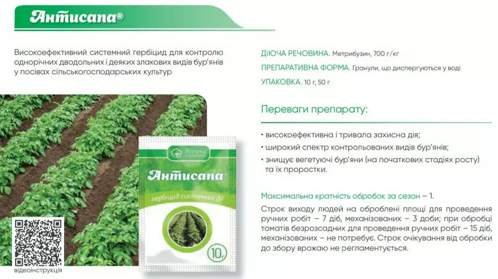 Антисапа - Высокоэффективный системный гербицид для контроля однолетних двудольных и некоторых злаковых видов сорняков в посевах сельскохозяйственных культур.