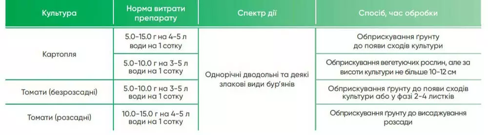 | Картофель | 5.0-15.0 г на 4-5 л воды на 1 сотку | Однолетние двудольные и некоторые злаковые виды сорняков | Опрыскивание почвы до появления всходов культуры |