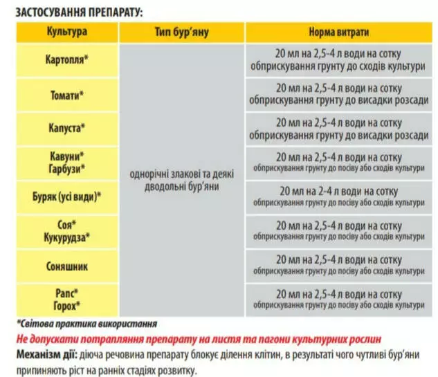 | Картофель | однолетние злаковые и некоторые двудольные сорняки | 20 мл на 2,5-4 л воды на сотку опрыскивание почвы до всходов культуры |