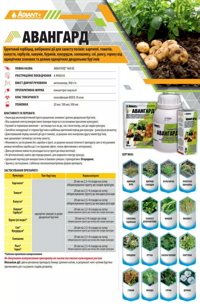 Авангард - Почвенный гербицид, избирательного действия для защиты посевов: картофеля, томатов, капусты, тыкв, арбузов, арбузов, свеклы, кукурузы, подсолнечника, сои, рапса, гороха, от однолетних, злаковых и некоторых однолетних двудольных сорняков.