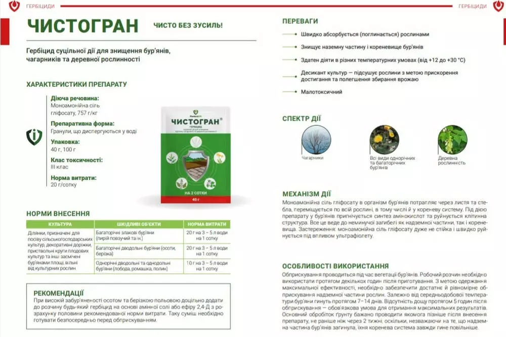 Чистогран - Гербицид сплошного действия для уничтожения сорняков, кустарников и древесной растительности.