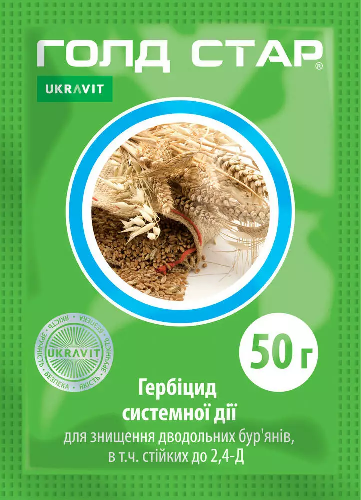 Голд Стар - Высокоэффективный послевсходовый гербицид системного действия для контроля двудольных сорняков, в том числе устойчивых к 2.4-Д, в посевах зерновых колосовых культур и устойчивого подсолнуха.