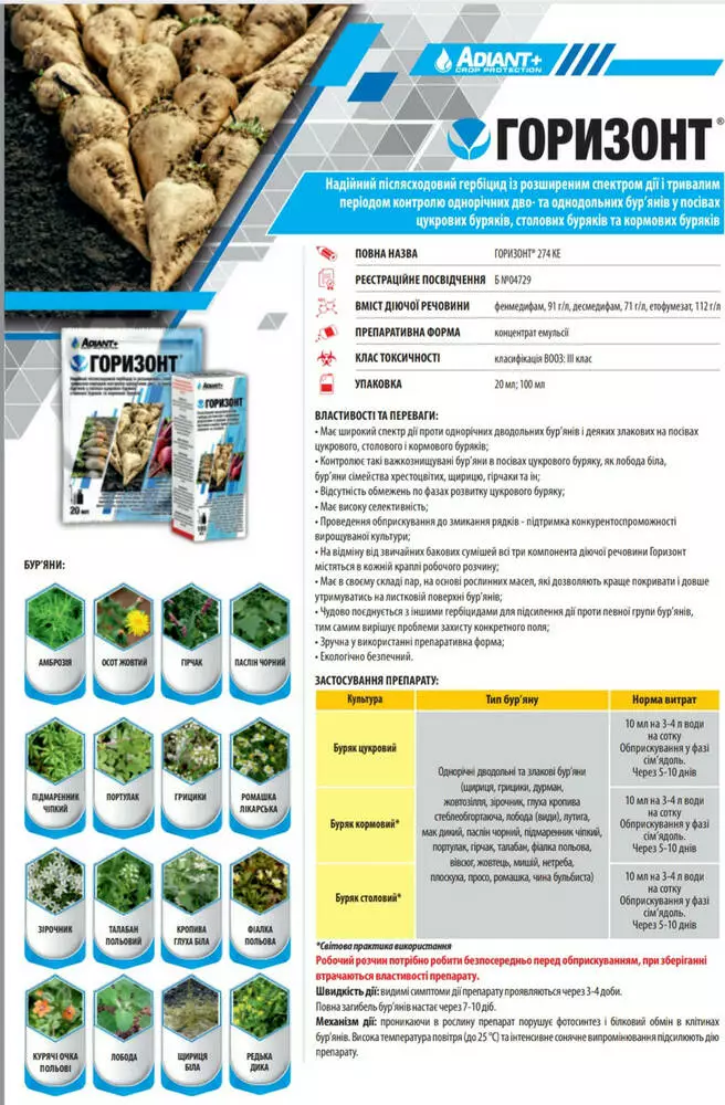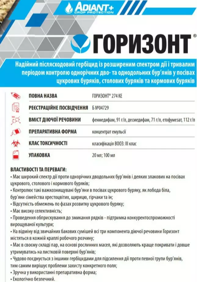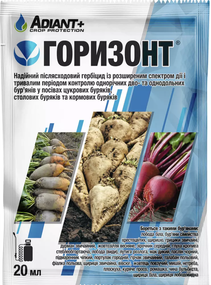 Горизонт - Надежный послевсходовый гербицид с расширенным спектром действия и длительным периодом контроля однолетних двух- и однодольных сорняков в посевах сахарной свеклы, столовой свеклы и кормовой свеклы.
