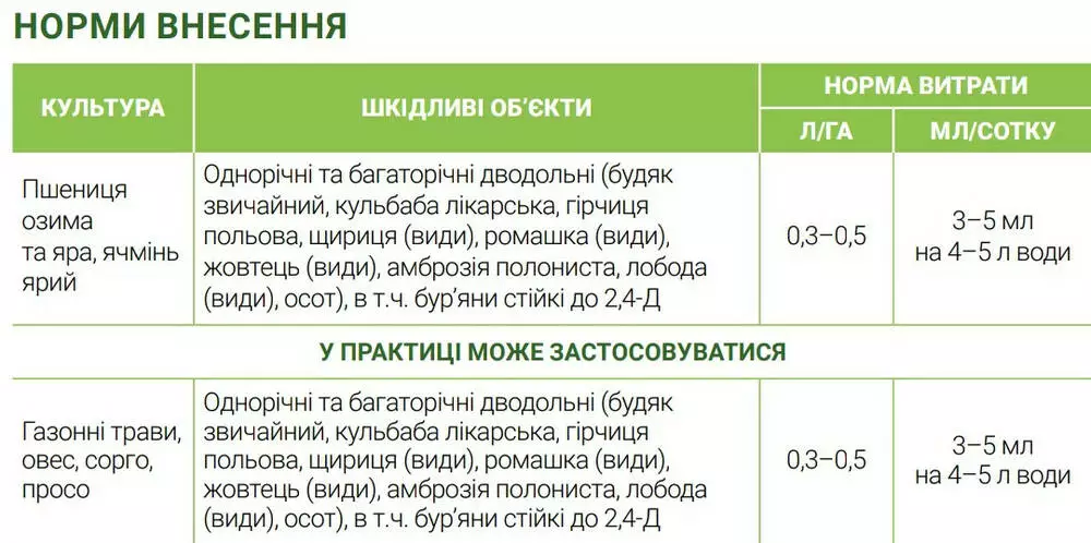 | Газонные травы, овес, сорго, просо | Однолетние и многолетние злаковые (чертополох обыкновенный, одуванчик лекарственный, горчица полевая, щирица (виды), ромашка (виды), лютик (виды), амброзия полонистая, лебеда (виды), осот), в т.ч. сорняки устойчивы к 2,4 -Д | 0,3-0,5 | 3-5 мл на 4-5 л воды |