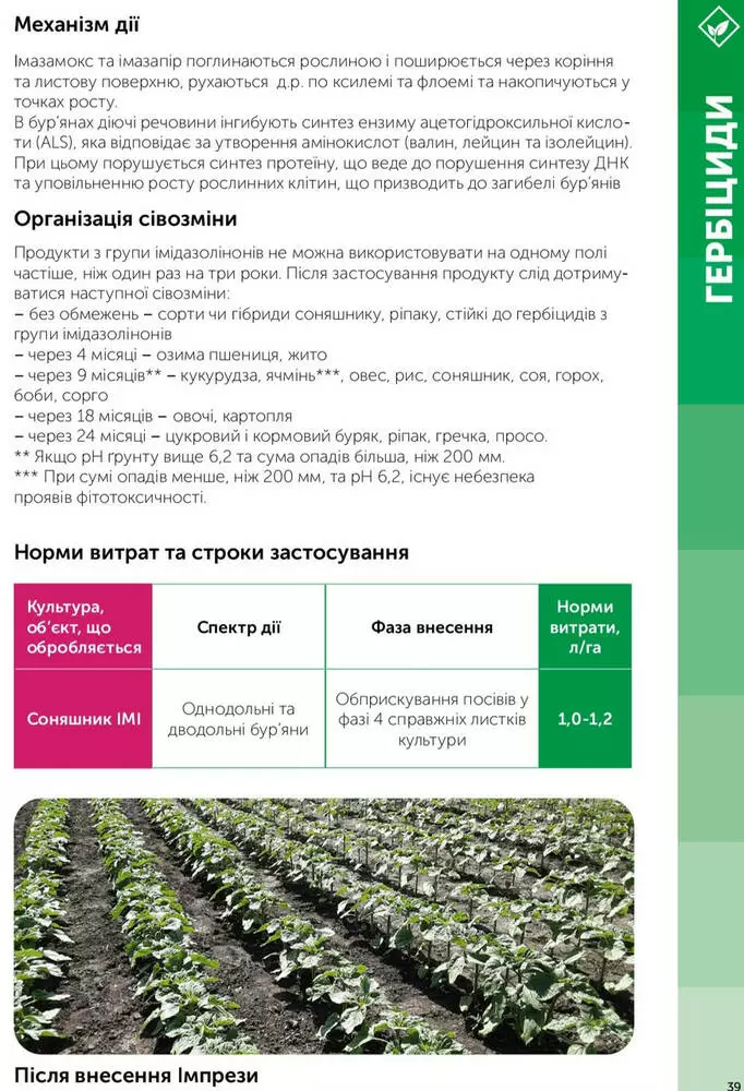| Подсолнух ИМИ | Однодольные и двудольные сорняки | Опрыскивание посевов в фазе 2-4 настоящих листьев культуры | 1,0-1,2 |