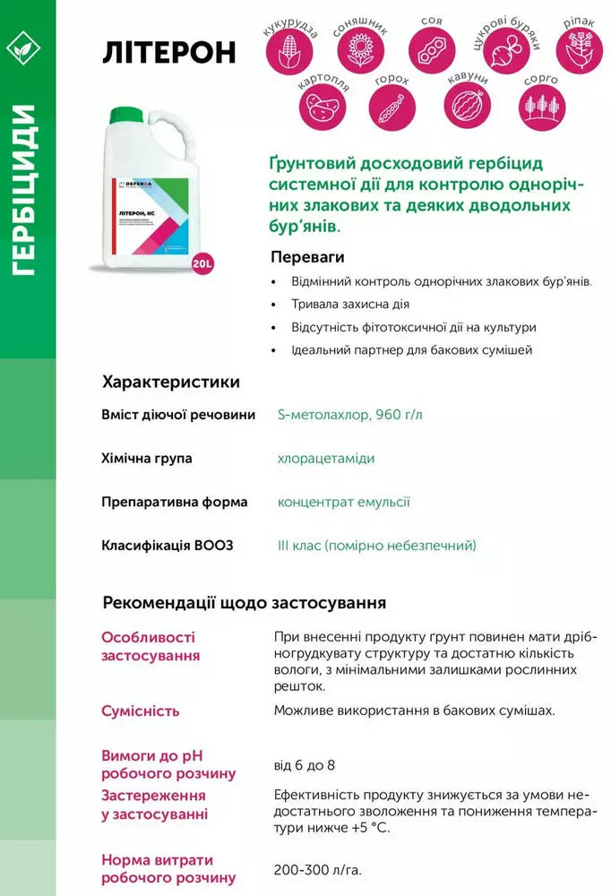 Литерон - Почвенный довсходовый гербицид системного действия для контроля однолетних злаковых и некоторых двудольных сорняков.