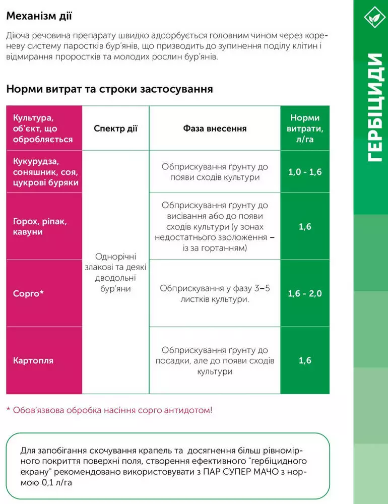 Механизм действия: Действующее вещество препарата быстро адсорбируется главным образом через корневую систему ростков сорняков, что приводит к остановке деления клеток и отмирания проростков и молодых растений сорняков.