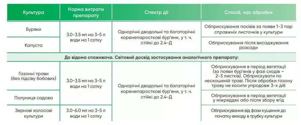 | Свекла | 3.0-3.5 мл на 3-5 л воды на 1 сотку | Однолетние двудольные и многолетние корнеотпрысковые сорняки, в т. ч. устойчивые к 2.4-Д | Опрыскивание посевов при появлении 1-3 пар настоящих листочков у культуры |