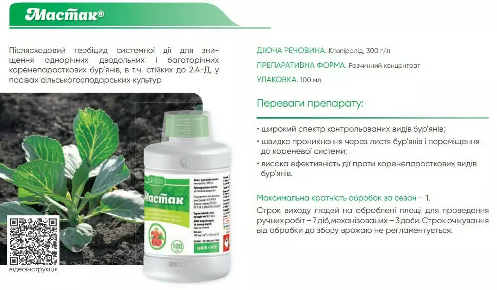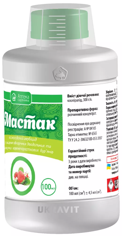 Мастак - Послевсходовый гербицид системного действия для уничтожения однолетних двудольных и многолетних корнеотпрысковых сорняков, в т.ч. устойчивых к 2.4-Д, в посевах сельскохозяйственных культур.