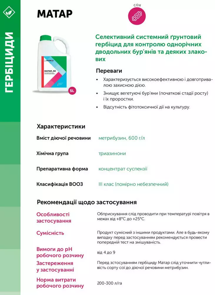 Матар - Селективный системный почвенный гербицид для контроля однолетних двудольных сорняков и некоторых злаковых. Аналог гербицида Зенкор Ликвид.