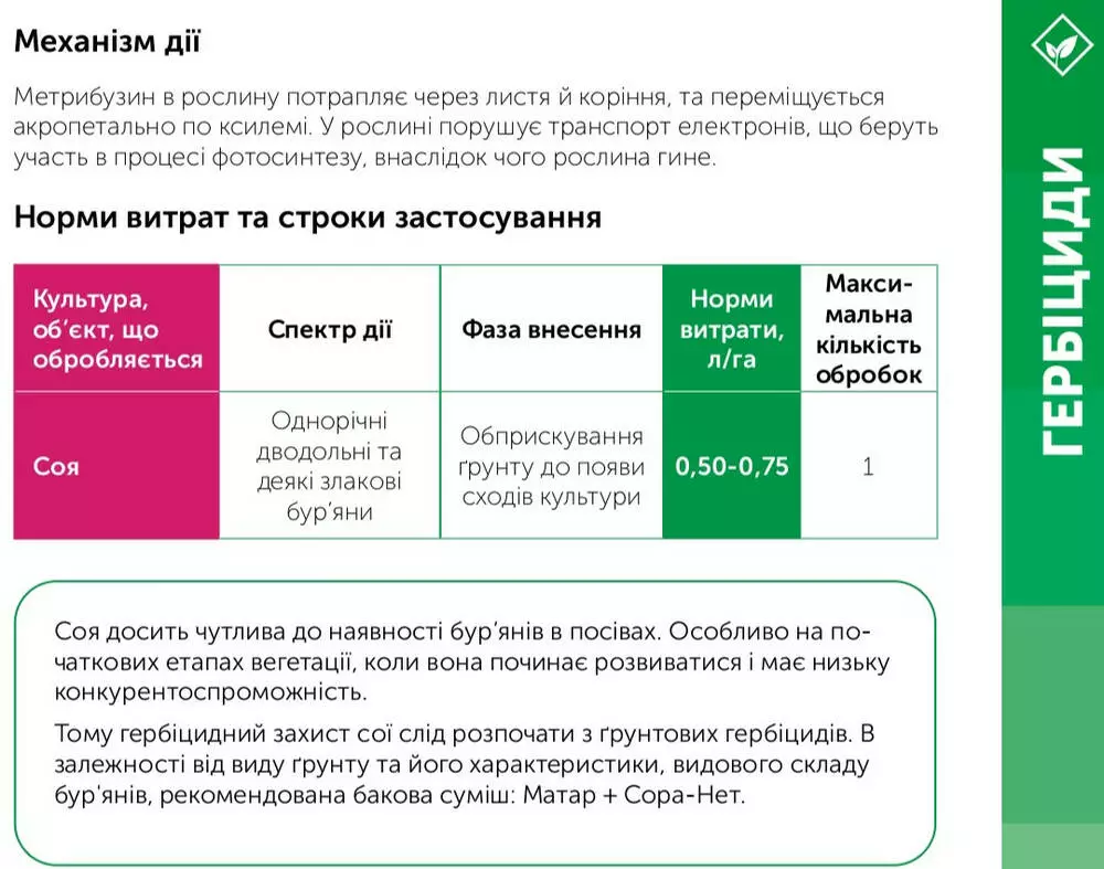 Соя достаточно чувствительна к наличию сорняков в посевах. Особенно на начальных этапах вегетации, когда она начинает развиваться и имеет низкую конкурентоспособность. Поэтому гербицидную защиту сои следует начать с почвенных гербицидов. В зависимости от вида почвы и ее характеристики, видового состава сорняков, рекомендована баковая смесь: Матар + Сора-Нет.
