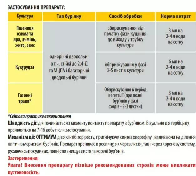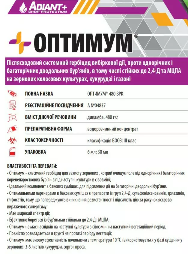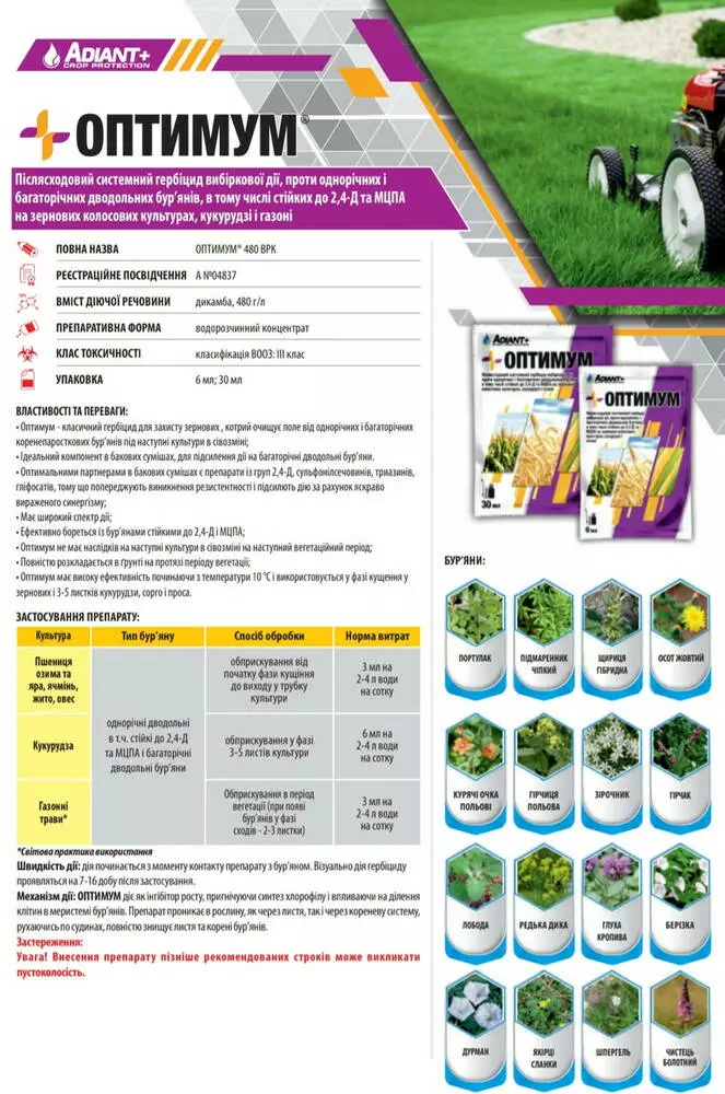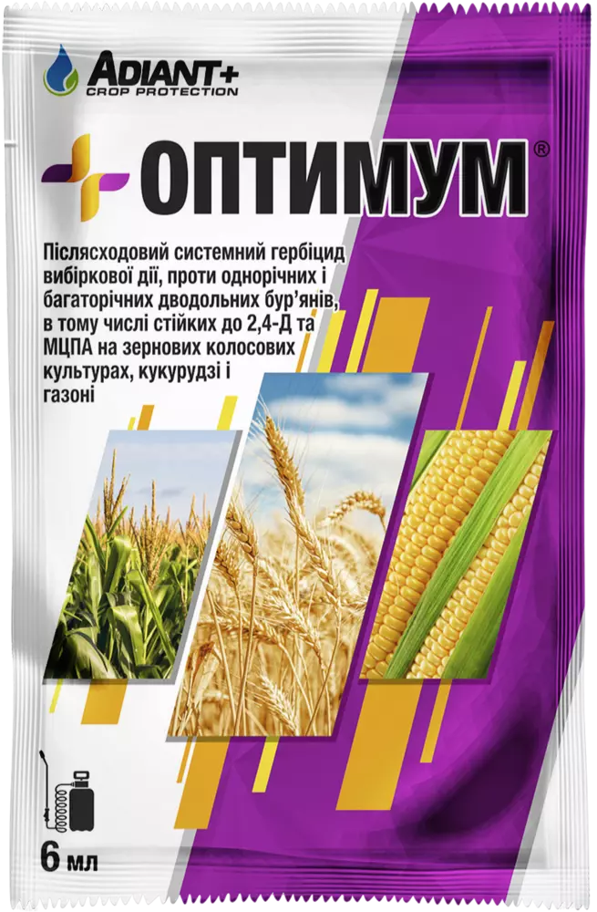 Оптимум - Послевсходовый системный гербицид избирательного действия, против однолетних и многолетних двудольных сорняков, в том числе устойчивых к 2,4-Д и МЦПА на зерновых колосовых культурах, кукурузе и газоне.
