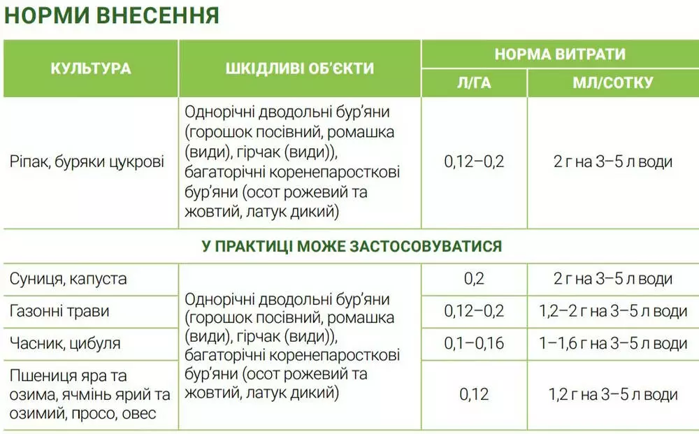 | Рапс, свекла сахарная | Однолетние двудольные сорняки (горошек посевной, ромашка (виды) горчак (виды), многолетние корнеотпрысковые сорняки (осот розовый и желтый, латук дикий) | 0,12 -0,2 | 2 г на 3-5 л воды |